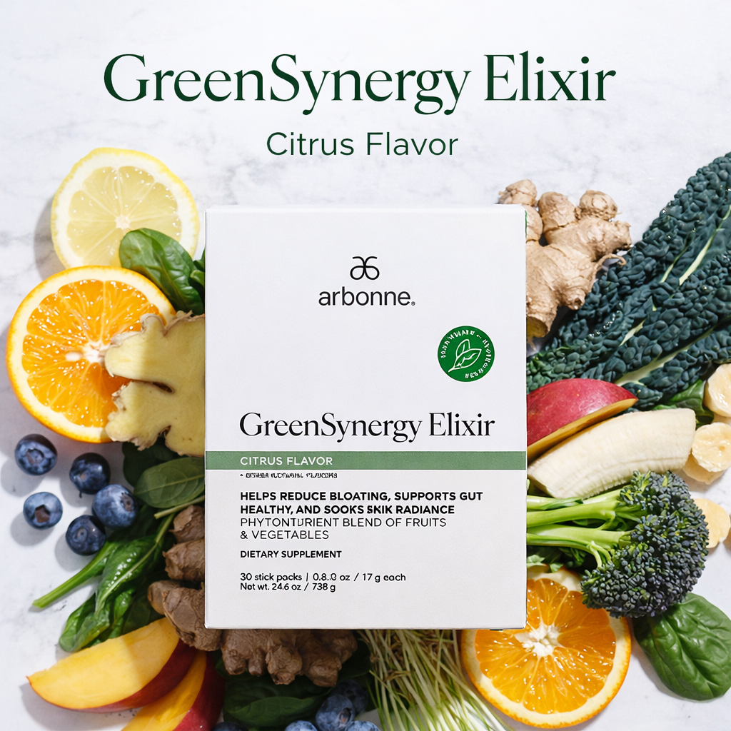 the greensynergy elixir has 13 full-spectrum digestive enzymes (hello, bye-bye bloat), a full serving of fruits and vegetables (spirulina, kale, spinach, mango, blueberry, tart cherry, i mean the list goes on), plus a vegan collagen builder and both prebiotics and probiotics. it’s citrus-flavored, mixes easily with water, no blending required, and it’s perfect for tossing in your bag when you’re shuffling the kids to school.