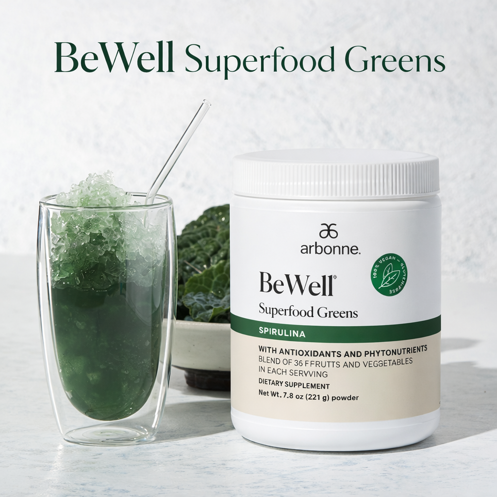 this is where bewell superfood greens comes in. one scoop delivers a blend of 36 fruits and vegetables: spirulina, chlorella, wheatgrass, barley grass, pomegranate, mango, blueberry, and so much more, all packed with antioxidants, phytonutrients, and prebiotic fiber. it’s naturally sweetened and mixes right into water, a smoothie, or whatever you’ve got going. the color spectrum in this formula supports immune health, reduces inflammation, and gives your gut the fiber it needs to thrive.